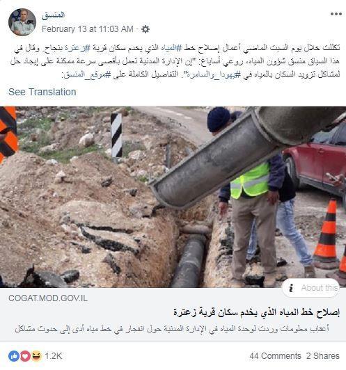 لكن، تدخل الإدارة المدنية الإسرائيلية وما يعرف بالمنسق يصل لأمور خدماتية وجزئيات خاصة بالمواطنين الفلسطيني دون التطرق لذكر هيئة الشؤون المدنية، وعلى سبيل المثال، جاء في صفحة المنسق خلال الاسبوع الفائت، عديد المنشورات التي تتعلق بالخدمات من بينها، "تكللت خلال يوم السبت الماضي أعمال إصلاح خط المياه الذي يخدم سكان قرية زعترة بنجاح".