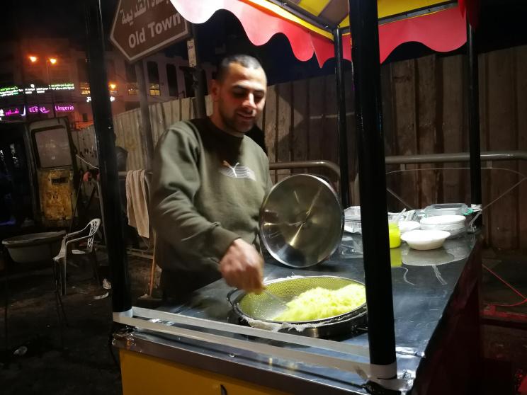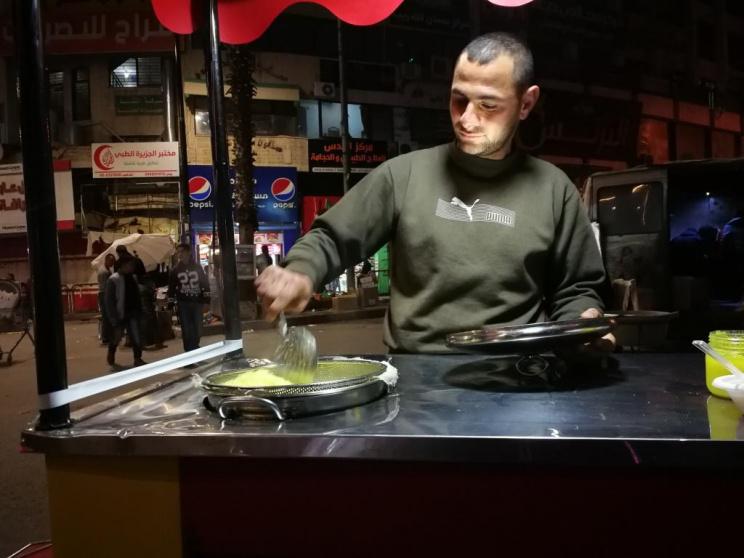 على منارة الخليل، تصطف عربة صغيرة، على هيئة مركبة أمريكية الطراز، فيها قدر متوسط الحجم، وهو بمثابة خزان وقود، لكن ذلك الوقود ليس للمركبة وإنما للمارة الذين يحاول الشاب العشريني نور الجولاني استقطابهم عبر نداءاته"على المبسبس، على الكنايف يا سخن، مبسبس مبسبس".