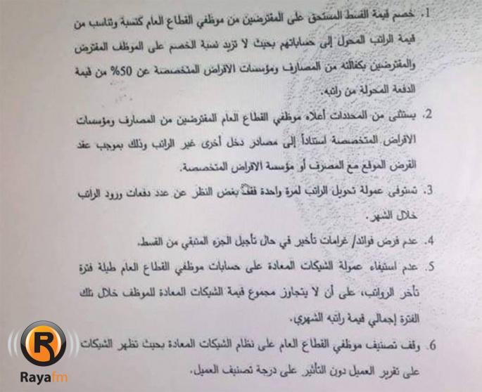 1- خصم قيمة القرض المستحق على المقترضين من موظفي القطاع العام، كنسبة وتناسب من قيمة الراتب المحول غلى حساباتهم بحيث لا تزيد نسبة الخصم على الموظف المقترض والمقترضين بكفالته من المصارف ومؤسسات الإقراض المتخصصة عن 50 بالمئة من قيمة الدفعة المحولة من راتبه.