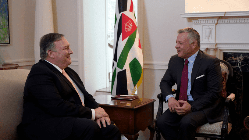 وذكرت وكالة الانباء الاردنية "بترا" ان لقاء الملك عبدالله الثاني مع وزير الخارجية الأمريكي مايك بومبيو ركز على آليات تعزيز العلاقات الأردنية الأمريكية، وسبل التوصل إلى حلول سياسية لقضايا وأزمات المنطقة.