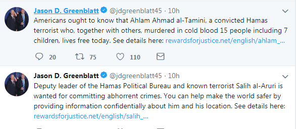 وقال المبعوث الأمريكي لعملية السلام في الشرق الأوسط، جيسون غرينبلات إن العاروري متهم بارتكاب جرائم بغيضة، وهو مطلوب.