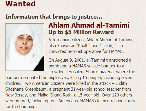 فيما اتهم البرنامج الأسيرة المحررة أحلام التميمي والتي تحمل الجنسية الأردنية، أنها أوصلت فلسطينيًا فجّر نفسه في مطعم ما أدى لمقتل 15 إسرائيليًا إلى جانب اثنين من المواطنين الأميركيين، وإصابة أربعة آخرين.