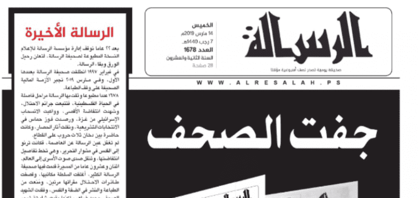 أعلنت صحيفة "الرسالة" التابعة لحماس والصادرة من قطاع غزة، اليوم الخميس، عن توقف نسختها الورقية، والتوجه إلى الإعلام الرقمي.