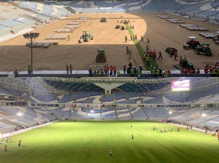 مد العاملون في استاد الوكرة، أحد الملاعب الثمانية المؤهلة لاستضافة مباريات مونديال قطر 2022، الأرضية العشبية، وذلك ضمن استعدادات الدوحة المتواصلة للبطولة العالمية.
