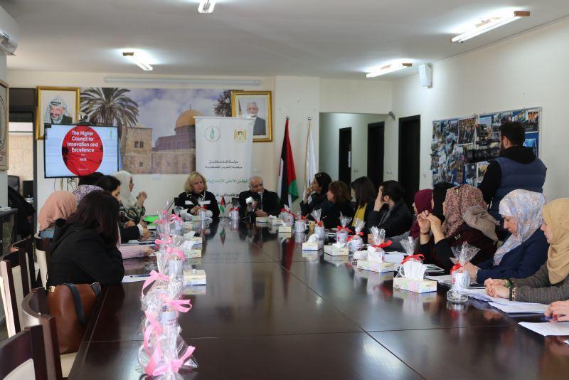 عقد المجلس الأعلى للإبداع والتميز، اليوم الثلاثاء، لقاء ثانياً بعنوان "هي مصدر القوة" والذي ضم نخبة من النساء القياديات والرياديات في المجتمع الفلسطيني، هدف إلى تقديم تدريب عملي لطالبات الجامعات في مؤسسات مختلفة، وذلك ضمن احتفالية العالم بيوم المرأة العالمي الذي يصادف الثامن من آذار لكل عام.
