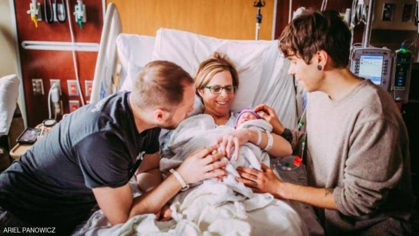 وبلغت المرأة سن اليأس قبل عشر سنوات، لكنها ظلت في صحة جيدة، وزود الأطباء جسمها بعدد من البويضات التي تبرعت بها الابنة البالغة من العمر 26 سنة، رغم ما قد تسببه عملية إنجاب كهذه، اشترك فيها الشاب المثلي وأخته وأمه، من انتقادات أخلاقية.