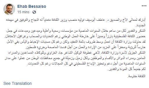 ودع وزيرا الثقافة والتربية والتعليم، ايهاب بسيسو وصبري صيدم وزارتيهما بعد تشكيل الحكومة الجديدة، عبر منشوارت على صفحتيهما في موقع فيسبوك.