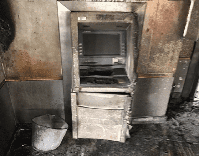 ووفقاً للصحيفة فقد تمكن رجال الإطفاء من إخماد النيران بسرعة والتي ألحقت أضراراً بآلة صرف النقود والباب الأمامي للبنك.