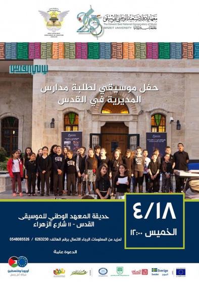 الحفل الموسيقي ستقدمه (جوقات القدس) و (وتريات القدس) وسيشمل على مقطوعات موسيقية للأخوين رحباني، والأستاذ سهيل خوري، والسيدة ريما ترزي، وسيد درويش، وزكي ناصيف مثل "النشيد الوطني، "أمي راحت تتسوق" و"حلوة يا بلدي" و"ونقيلي أحلى زهرة"، و"حلوة يا بلدي" و "الحلوة دي" و "نحن والقمر جيران" و "موطني" و"ايقاعات للجيل الجديد". بالاضافة الى ذلك سيتم توزيع الشهادات في نهاية الحفل.