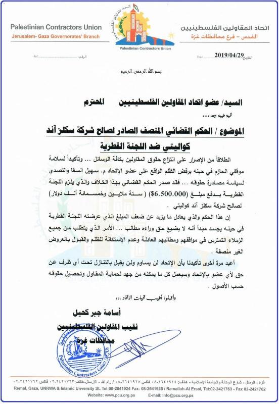 أعلن نقيب المقاولين بغزة أسامة كحيل عن نجاح المقاول عضو الاتحاد م. سهيل السقا، في انتزاع حكم قضائي يلزم اللجنة القطرية لإعادة الاعمار بدفع مبلغ بقيمة 6.5 مليون دولار لصالح شركة سكلز أند كواليتي للمقاولات التي يرأسها م. السقا.