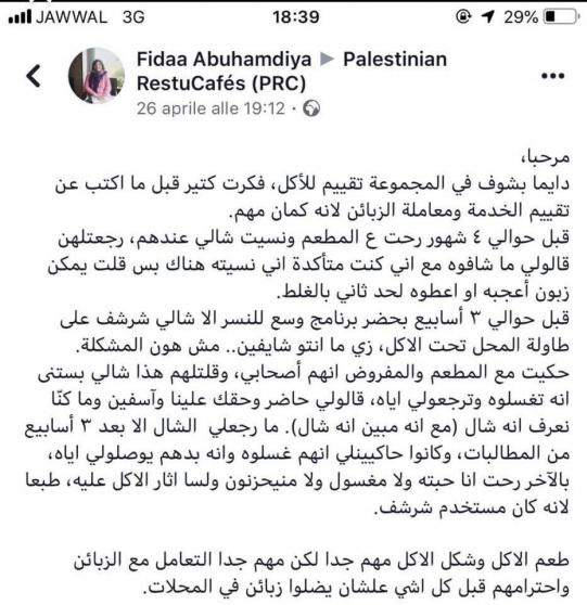 وفي التفاصيل، فقد نشرت المواطنة فداء أبو حمدية ما حدث معها حين زارت المطعم، على مجموعة خاصة بالمطاعم والمقاهي في رام الله، حيث ذكرت أنها كانت قد نسيت شالها بعد زيارته، وحين سألت عنه لاحقاً أخبرتها الإدارة انه غير موجود.