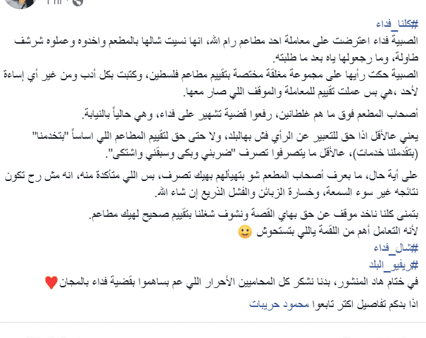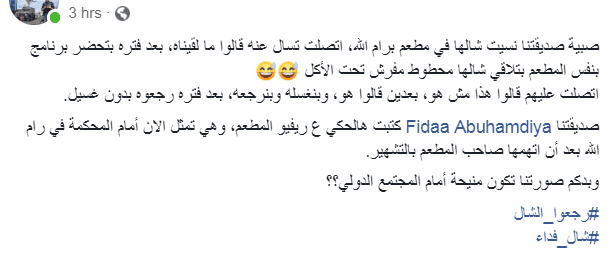 على وسم "شال_فداء" غرد عشرات النشطاء عبر مواقع التواصل الاجتماعي اليوم مستنكرين قيام أحد المطاعم في مدينة رام الله برفع قضية على مواطنة بتهمة التشهير على خلفية ما روته من قصة حدثت معها عقب زيارتها للمطعم.