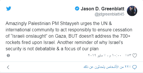 غرّد المبعوث الأمريكي للشرق الأوسط جيسون غرينبلات، عبر تويتر، مهاجما رئيس الوزراء محمد اشتية، لتجنّبه ذكر الصواريخ التي أطلقتها فصائل المقاومة في غزة، على إسرائيل.