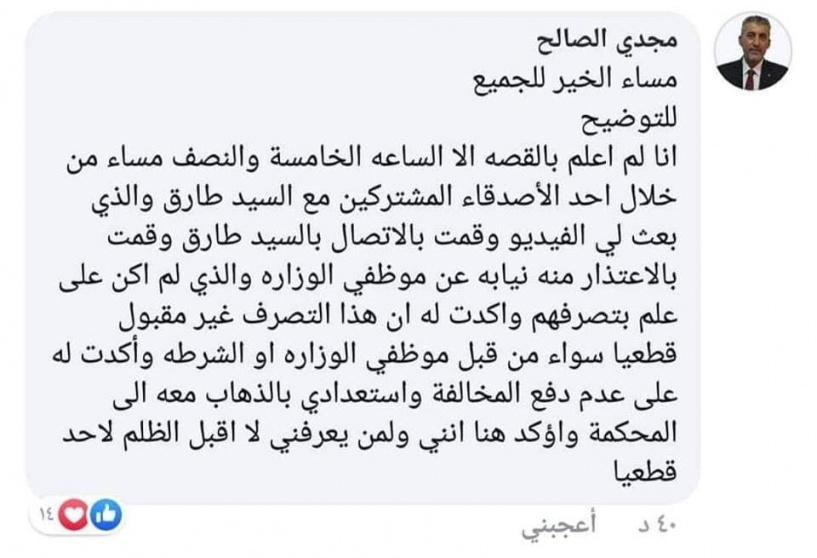 وبعد ساعات من نشر الفيديو جاء رد وزير الحكم المحلي مجدي الصالح في تعليق أسفل منشور الشاب، وكتب فيه: "مساء الخير للجميع.. للتوضيح، انا لم اعلم بالقصه الا الساعه الخامسة والنصف مساء من خلال احد الأصدقاء المشتركين مع السيد طارق والذي بعث لي الفيديو وقمت بالاتصال بالسيد طارق وقمت بالاعتذار منه نيابه عن موظفي الوزاره والذي لم اكن على علم بتصرفهم واكدت له ان هذا التصرف غير مقبول قطعيا سواء من قبل موظفي الوزاره او الشرطه وأكدت له على عدم دفع المخالفة واستعدادي بالذهاب معه الى المحكمة واؤكد هنا انني ولمن يعرفني لا اقبل الظلم لاحد قطعي".