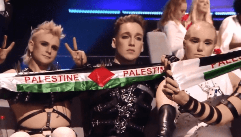 رفع فريق آيسلندا علم فلسطين في نهائي مسابقة الأغنية الأوروبية "يوروفيجن" التي أقيمت في تل أبيب.