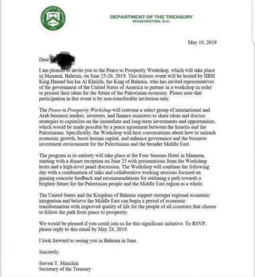 حصلت رايـة على صورة للدعوة التي وجهها وزير المالية الأمريكي ستيف منوشين لرجال اعمال واقتصاديين فلسطينيين للمشاركة في "مؤتمر المنامة" الاقتصادي، الذي يمهد لصفقة القرن.