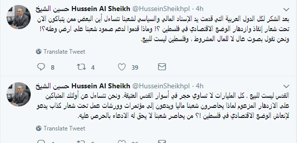 وغرد الشيخ عبر حسابه على "تويتر" قائلا:" نحن نتساءل عن أولئك المتباكين على الازدهار المزعوم لماذا يحاصرون شعبنا ماليا ويدعون إلى مؤتمرات وورشات عمل تحت شعار كذاب يدعو لإنعاش الوضع الاقتصادي في فلسطين؟! ".