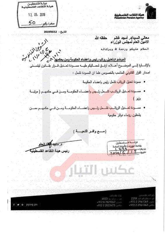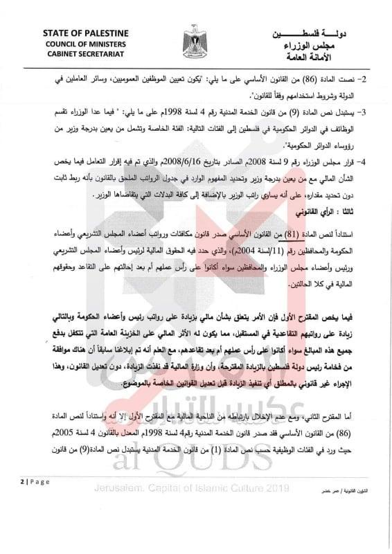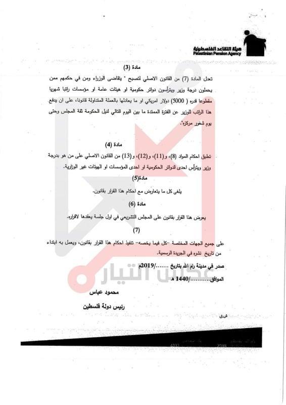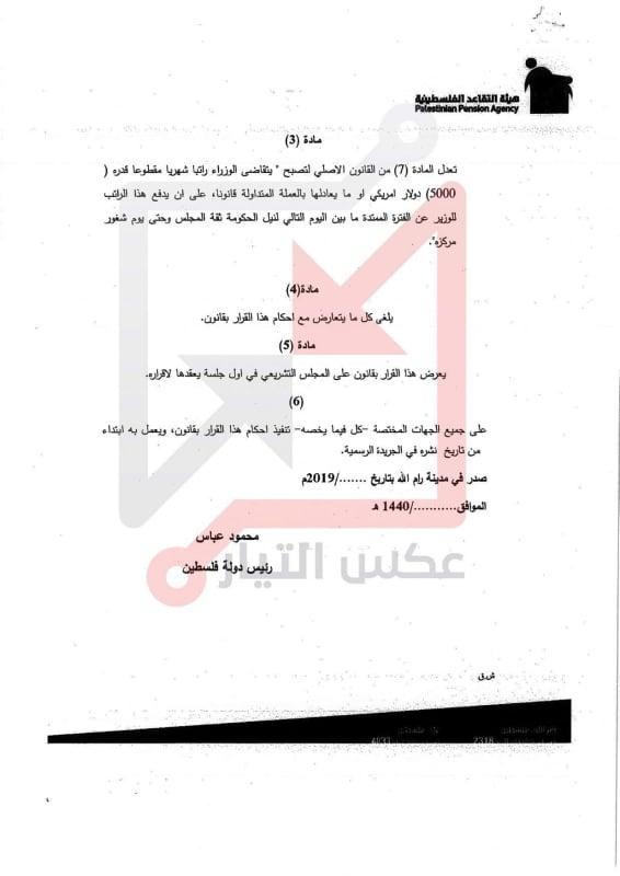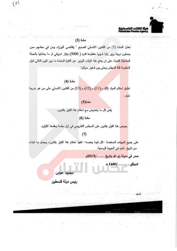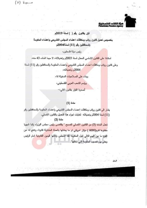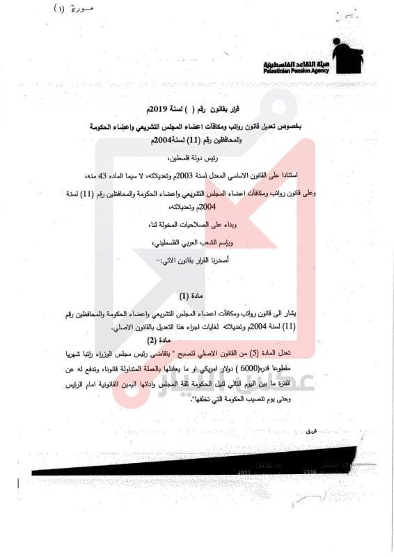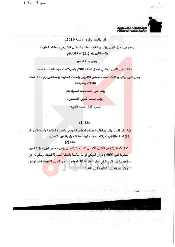 وبحسب الوثائق فان راتب رئيس الوزراء يصبح 6000 دولار بدلا من 4000 فيما بلغ راتب الوزراء 5000 دولار بدلا من 3000 وذلك ضمن ما سمي بقرار بقانون لتعديل قانوني متعلق في هذا الشأن.