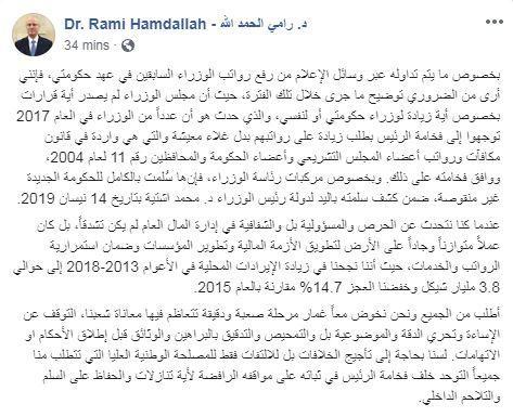 وقال الحمد الله في منشور على صفته في "فيسبوك": بخصوص ما يتم تداوله عبر وسائل الإعلام من رفع رواتب الوزراء السابقين في عهد حكومتي، فإنني أرى من الضروري توضيح ما جرى خلال تلك الفترة، حيث أن مجلس الوزراء لم يصدر أية قرارات بخصوص أية زيادة لوزراء حكومتي أو لنفسي، والذي حدث هو أن عدداً من الوزراء في العام 2017 توجهوا إلى فخامة الرئيس بطلب زيادة على رواتبهم بدل غلاء معيشة والتي هي واردة في قانون مكافآت ورواتب أعضاء المجلس التشريعي وأعضاء الحكومة والمحافظين رقم 11 لعام 2004، ووافق فخامته على ذلك. وبخصوص مركبات رئاسة الوزراء، فإنها سُلمت بالكامل للحكومة الجديدة غير منقوصة، ضمن كشف سلمته باليد لدولة رئيس الوزراء د. محمد اشتية بتاريخ 14 نيسان 2019.