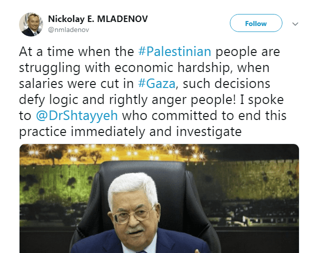 وأضاف ميلادينوف في تغريدة على حسابه في موقع "تويتر" إن قرار زيادة رواتب الوزراء جاء في وقت يعاني فيه الشعب الفلسطيني صعوبات اقتصادية كبيرة، وأن مثل هذه القرارات تشكل تحدياً للمنطق وتثير غضب الناس.