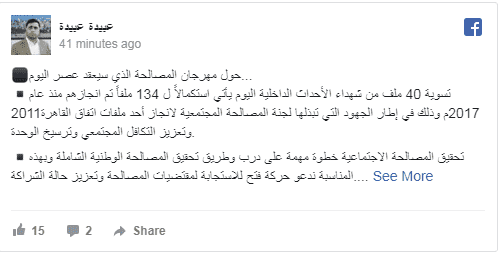 وتابع: "إنجاز ما يزيد عن 170 ملفا من ملفات المصالحة المجتمعية يعبر عن حالة التسامح التي يعيشها شعبنا والأصالة التي يتمتع بها وعن حاجته الملحة لطي مرحلة الانقسام وتحقيق الوحدة الوطنية الكاملة لمواجهة التحديات الراهنة".