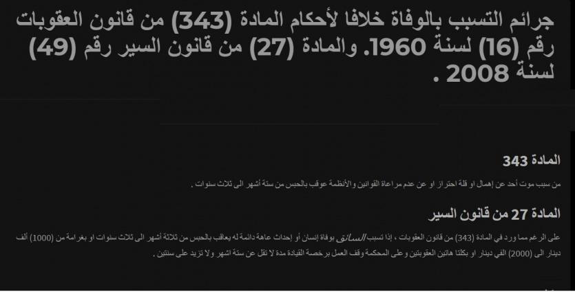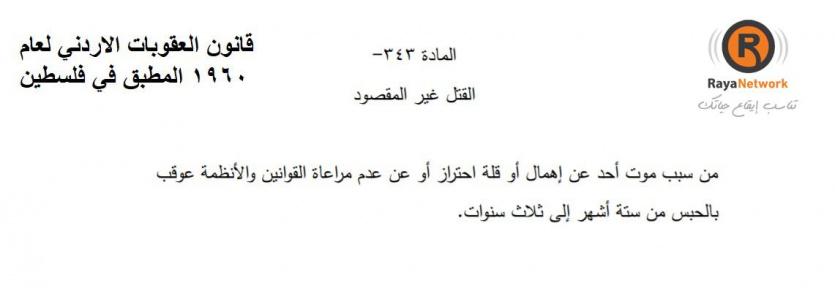 يشار الى أن المادة 343 تنص على: "من سبب موت أحد عن إهمال او قلة احتراز او عن عدم مراعاة القوانين والأنظمة عوقب بالحبس من ستة أشهر الى ثلاث سنوات".