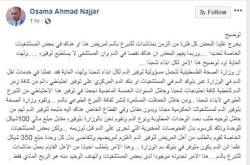 واوضح الناطق باسم وزارة الصحة اسامة النجار عبر صفحته على فيسبوك: "ان وزارة الصحة تتحمل مسؤولية توفير الدم لكل ابناء شعبنا ولهذه الغاية فقد عملنا في خدمات نقل الدم في الوزارة عبر بنوك الدم في المستشفيات او بنك الدم المركزي على توفير احتياطي دائم من كافة زمر الدم لتغطية كافة احتياجات شعبنا وخلال السنوات الخمسة الماضية نجحنا في توفير هذا الاحتياطي من التبرع الطوعي لابناء شعبنا".