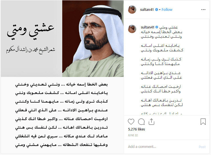 وأثارت قصيدة نشرها بن راشد يوم 22 يونيو/حزيران الماضي التكهنات بأنه كان يقصد بها زوجته هيا التي فرّت منه، وقال موقع The Daily Beast الأمريكي، إن حاكم دبي هجا زوجته في أبيات شعر نشرها على حسابه الرسمي في موقع إنستغرام.