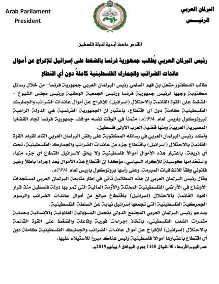 وأكد رئيس البرلمان العربي في رسائله المكتوبة على رفض البرلمان العربي التام لقيام القوة القائمة بالاحتلال (إسرائيل) باقتطاع جزء من عائدات الضرائب والجمارك الفلسطينية، تحت أي ذريعة، باعتبار هذه الأموال أموالاً فلسطينية ولا يحق لإسرائيل اقتطاع أي جزء منها، واستخدامها كوسيلة للإكراه السياسي، مؤكداً إن اقتطاع هذه الأموال يُعد إجراءاً باطلاً وغير قانوني وفقاً للاتفاقيات المبرمة، وعلى رأسها بروتوكول باريس لعام 1994م.