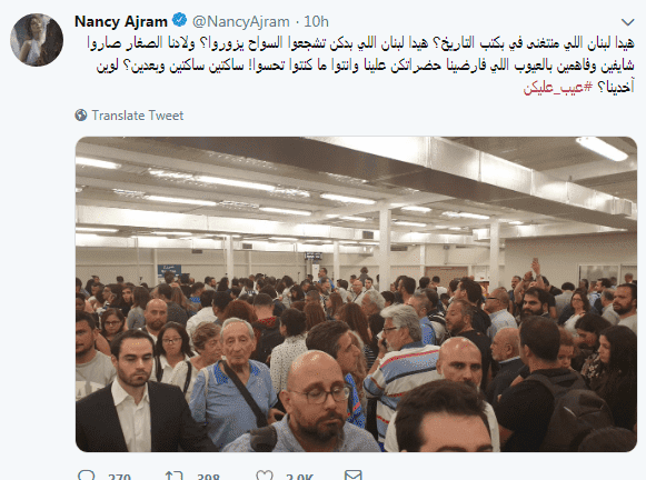 بعدها، نشرت نانسي صورة للمطار ظهر فيها الازدحام، وعلّقت عليها: "هيدا لبنان اللي منتغنى في بكتب التاريخ؟، هيدا لبنان اللي بدكن تشجعوا السواح يزوروا؟، ولادنا الصغار صاروا شايفين وفاهمين بالعيوب اللي فارضينا حضراتكن علينا وانتوا ما كنتوا تحسوا! ساكتين ساكتين وبعدين؟ لوين آخدينا؟ عيب عليكن".