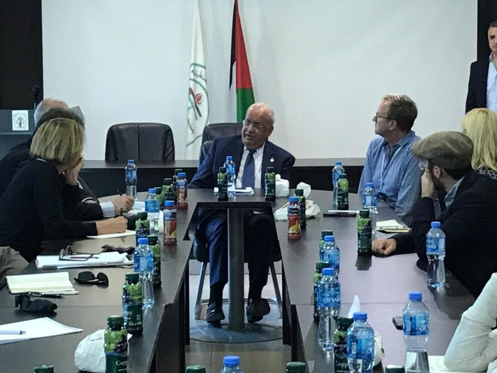 واضاف عريقات خلال لقائه وفدا من اساتذة الجامعات الأمريكية: "ما تحدث به الرئيس عباس ليس شروطا، وانما مرجعيات متفق عليها وقانون دولي، ومواقف دول العالم اجمع باستثناء اسرائيل وفريق الرئيس ترامب، الذين يعتقدون ان السلام يتحقق بالحفر والنبش والمطارق وترويج الحكايات الزائفة والتى ليس لها مكان فى مواقع الحقائق والواقعية، فقط بعقول من يعتقدون ان الحل لن يتحقق الا بقبول الاستسلام للاحتلال والاستيطان".