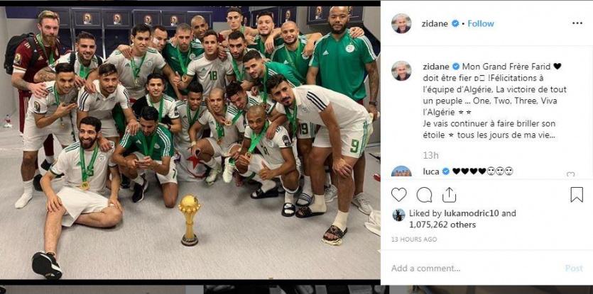 قدم المدير الفني لريال مدريد الإسباني زين الدين زيدان، تهنئة للمنتخب الجزائري لكرة القدم، بعد تتويجه، الجمعة، بلقب كأس الأمم الأفريقية التي أقيمت في مصر.
