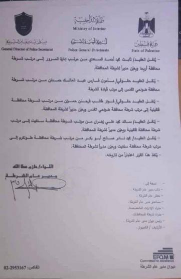 صادق اللواء حازم عطا الله مدير عام الشرطة الفلسطينية، على تنقلات وتعيينات في قيادة الشرطة في محافظات الضفة.