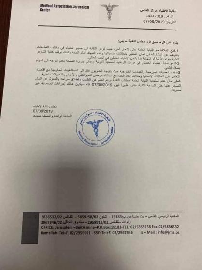 أعلنت نقابة الأطباء، فجر اليوم الأربعاء، قطع العلاقة مع النيابة العامة في لجان التحقيق، وعدم الشهادة أمام النيابة، وإيقاف كتابة التقارير الطبية، حتى اشعار اخر، وذلك رداً على بيان النيابة، بشأن توقيف طبيب في مدينة قلقيلية.