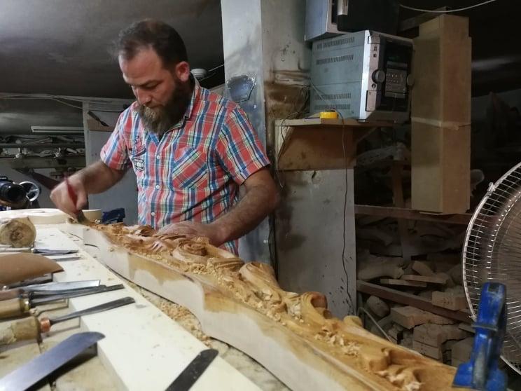 فهمي الكركي، 60 عامًا، امتهن النجارة عن أبيه قبل خمسة وأربعين عامًا، عندما كان عمره 14 عامًا، وأتقنها بحرفية عالية أوائل العشرينيات من عمره، يقول: "لا يوجد شيء معقد ما دام الإنسان يستخدم عقله، فلا شيء يصعب عليّ، وكلما زادت تعقيدات الرسمة زادت رغبتي بانجازها بحرفية عالية".