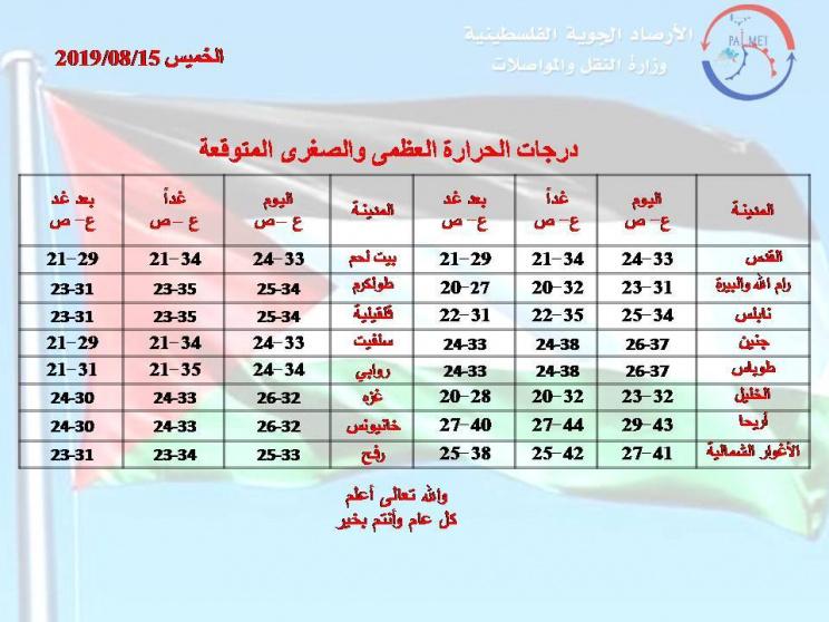تتعرض فلسطين لأجواء حارة اليوم الخميس حتى مساء يوم الجمعة ويتحول الطقس الى معتدل يوم السبت ومشمس يوم الاحد حسب الأرصاد الجوية الفلسطينية.