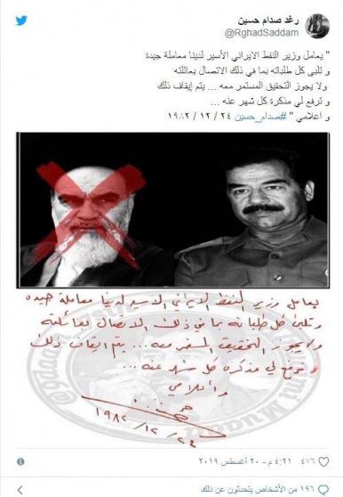 نشرت رغد ابنة الرئيس العراقي الراحل صدام حسين، رسالة نصية نادرة بخط يد والدها، تحمل أوامر بحق وزير إيراني أسر بالحرب التي اندلعت بين البلدين في ثمانينيات القرن الماضي.