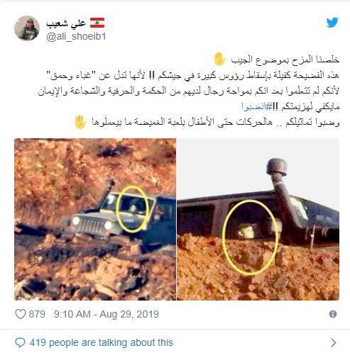 نشر مراسل قناة المنار التابعة لحزب الله في لبنان علي شعيب عبر حسابه على تويتر صورًا لجيش الاحتلال، استخدم فيه الأخيرا تماثيل في عربات عسكرية عند الحدود مع لبنان.