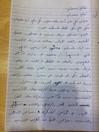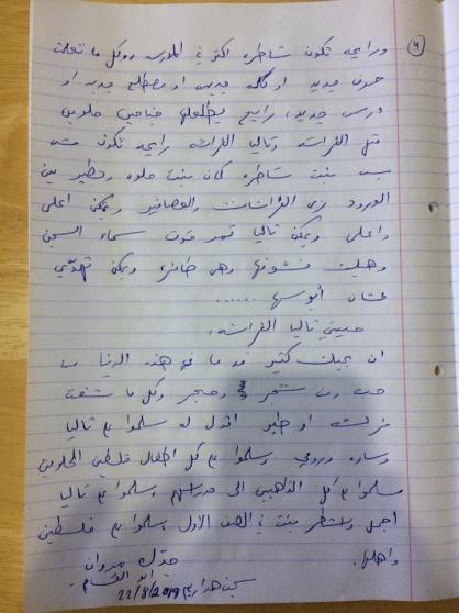 انا بحبك كثير قد ما في هذه الدنيا من حب ومن شجر وحجر وكل ما شفت فراشة او طير اقول له سلموا على تاليا وسارة ورومي وسلموا على كل أطفال فلسطين الحلوين سلموا على كل الذاهبين الى مدارسهم، سلموا على تاليا أجمل وأشطر بنت في الصف الأول وسلموا على فلسطين وأهلها.