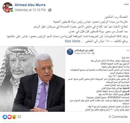 وقال الناشط احمد ابو مرة إنه بناء على مناشدة تقدم بها لعلاج الحاجة عبد الفتاح من ابناء قطاع غزة، قام سفير دولة فلسطين في عمان بالتواصل معه واخذ كافة المعلومات عن المريضة وأرسلها الى الرئيس ابو مازن الذي وافق بدوره على علاجها ودفع تكاليف المشفى.