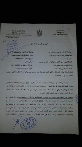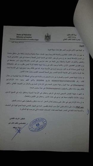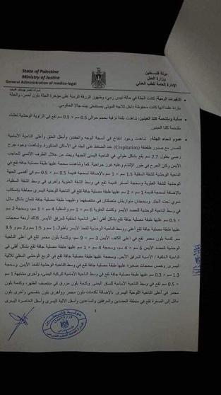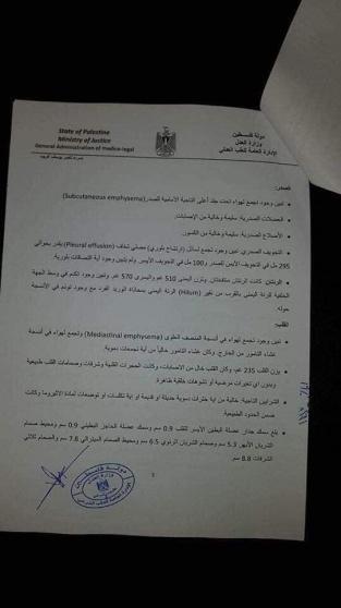 وجاء في التقرير أن إسرء توفيت نتيجة "قصور حاد بالجهاز التنفسي والانسجة تحت الجلد في الصدر نتيجة لمضاعفات الإصابات المتعددة التي تعرضت لها".