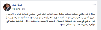 وكتب كميل على صفحته عبر "فيسبوك": "سيادة الرئيس يكلفني محافظا لمحافظة سلفيت وبهذه المناسبه اتقدم لاخي وصديقي المحافظ اللواء ابراهيم بلوي بجزيل التقدير والاحترام على كل هذا الجهد الذي بذله طوال اكثر من اربع سنوات هناك بابداع وصدق".
