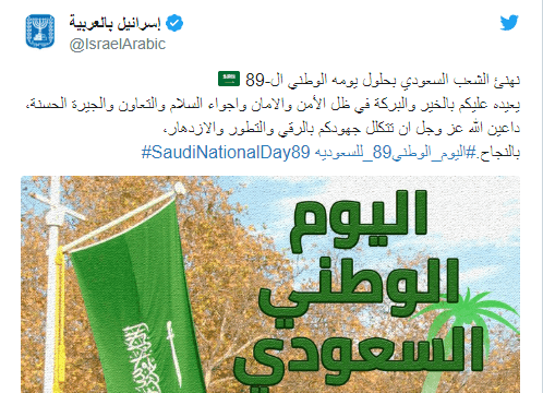 هنأت الخارجية الإسرائيلية اليوم الاثنين، السعودية بمناسبة العيد الوطني الـ 89 عبر تغريدة باللغة العربية على حسابها في تويتر.
