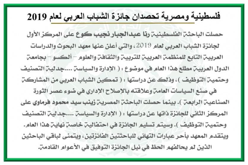 أعلنت اللجنة الوطنية الفلسطينية للتربية والثقافة والعلوم، فوز الباحثة الفلسطينية رنا عبد الجبار نجيب الكوع، بالمركز الأول لجائزة الشباب العربي للعام 2019، التي نظمها معهد البحوث والدراسات العربية التابع للمنظمة العربية للتربية والثقافة والعلوم "ألكسو"، بجامعة الدول العربية، في مواضيع: "الإدارة السياسية، وجدلية التصنيف، وحتمية التوظيف".