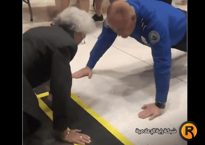 ودخلت العسكرية القديمة في تحد مع عنصر من إدارة أمن النقل الأميركية، فقام الاثنان بالنزول أرضا، وأنجزا تمرين الضغط من 7 مرات صعودا وهبوطا.