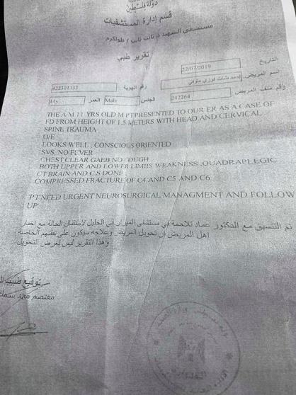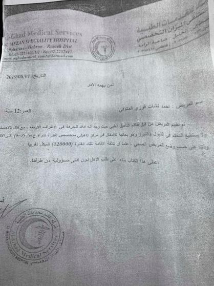 ويضيف تقرير مشفى الميزان أن الطفل يحتاج إدخال إلى مركز تأهيلي لفترة من 3-6 شهور على الأقل وذلك حسب وضع المريض، على أن تكلفة الإقامة تبغ 120 الف شيكل تقريبا.