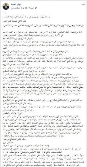 وتابع: هذا ما لم يعجب الأستاذ العيسة الذي أراد على ما يبدو أن يستفرد بالبرنامج (أو المغرفة كما يصفها كذباً حيث لا يوجد أي مغرفة) لوحده، ولم يرغب بمشاركة أي وزارة إلا بالحد الأدنى، الأمر الذي رفضه مجلس الوزراء.