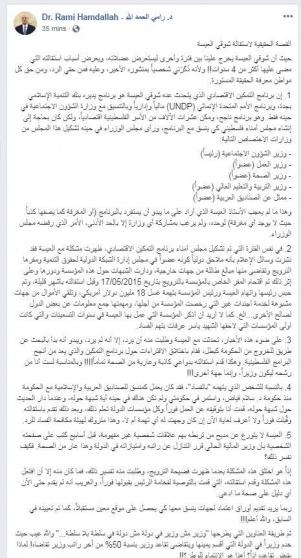 وأشار الحمد الله في منشوره إلى أنه "على ضوء هذه الأخبار، تحدثت مع العيسة وطلبت منه أن يرد، إلا أنه لم يرد، ويبدو أنه بدأ بالبحث عن طريق للخروج من الحكومة كبطل، فقام باختلاق الافتراءات حول برنامج التمكين والذي يعد من أنجح البرامج الفلسطينية. وهكذا قدم استقالته بدواعي كاذبة وعارية من الصحة تماماً!!!! وبالمناسبة لست أنا من رشحه ليكون وزيراً، وإنما جهة أخرى!!!".