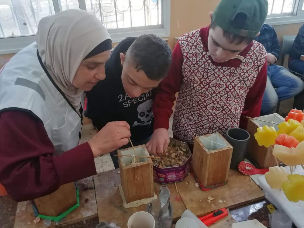 الطلبة من الأشخاص ذوي الإعاقة العقلية، والاعاقات البسيطة والمتوسطة ينشغلون بورشة الشمع بكل خطواتها باستثناء خطوة "الكي" فلا تسمح لهم المشرفة ردينة بمساسه حتى لا يحرقوا أيديهم خاصة أنه يحتاج لدقة والطلبة غالبيتهم يعانون من رجفة باليدين.
