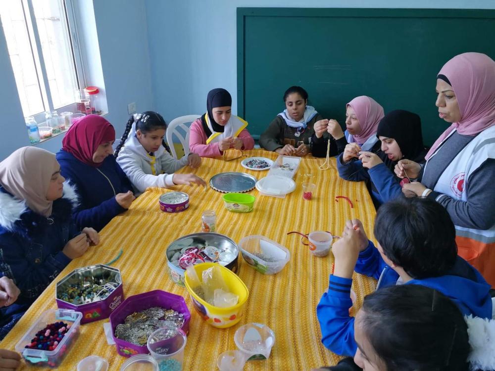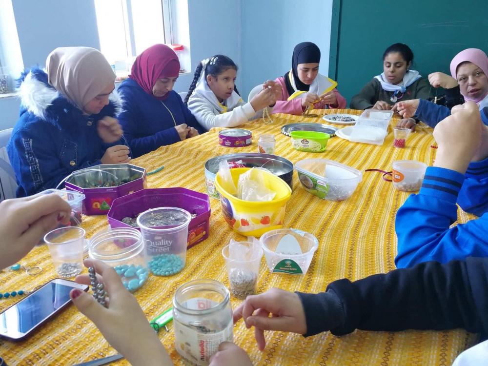خيوط ومقصّات، حبات خرز ملونة، منها الفيروزي والنهدي والكريمي وألوان العلم الفلسطيني وأكثر، تداعبها أنامل مرتجفة لأمر متصل بالجهاز العصبي، وتبنيها واحدة وراء الأخرى بروح مليئة بالحياة رغم الإعاقات المختلفة لا سيّما الاعاقة العقلية.